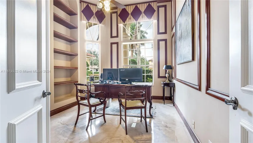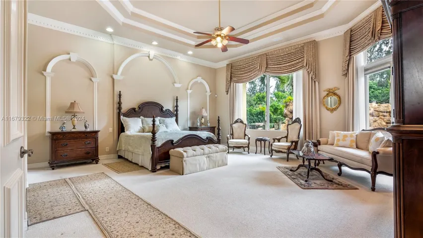 Welcome to this exquisite custom-built home on a builder’s acre in the prestigious gated community of Stonebrook Estates. This luxurious residence features a grand foyer leading into formal living and dining areas, and a gourmet kitchen with a wet bar. Enjoy coffered ceilings, expansive picture windows, and custom doors that flood the space with natural light. The split floor plan offers a lavish primary ensuite with a sitting area, dual closets, and a spa bath. Spacious bedrooms with one serving as a home gym with cabana bath and separate entrance. Step outside to a private fenced backyard with a swimming pool, grotto waterfalls, a pool slide, caves, and tropical landscaping. Host gatherings in the covered outdoor summer kitchen and relax on the deck while enjoying views of lush greenery.