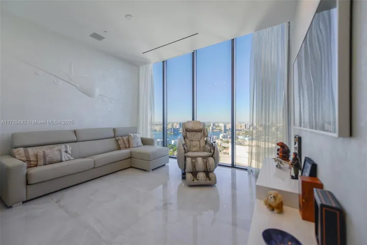 Enjoy unobstructed City, Intracoastal, and some ocean views from this high-floor corner residence in Muse Sunny Isles Beach. This remodeled with designer finishes 2 bed and 2,5 bath smart home unit with private foyer entry, 12’ ceilings, and gourmet kitchen. The floor plan was improved by expanding the living room, Italian porcelain floors throughout, bubble water panel with LED lights, handcrafted onyx in the guest bathroom, bamboo wallpapers, black marble slabs give the elegant covering of the columns at the balcony, and Italian doors. Large outdoor living space w/summer kitchen. With only 63 ultra-luxury exclusive residences Designed by Carlos Ott, an edge pool and spa overlooking the Atlantic Ocean, a State-of-the-art fitness center, and a Fully automated parking system.