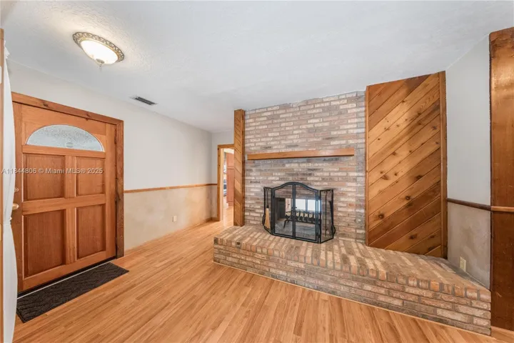 Nestled on an oversized canal-front corner acre lot in the heart of Davie, this unique property blends rustic charm with modern upgrades and NO HOA. Bring your horses and enjoy wood floors, a double-sided wood-burning fireplace, a new A/C (2023), and a new roof (2022). The primary bathroom was completely renovated in 2024. Impact sliding doors in the living room and primary suite lead to a tropical oasis with mature fruit trees, a chickee hut with a new roof, a pool with a waterfall, a Jacuzzi, and a 50-amp RV hookup. The septic tank was just recently pumped out as well.