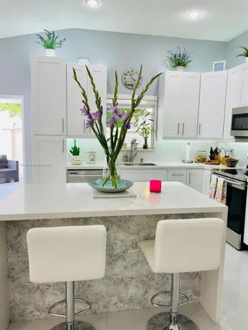 Beautifully Remodeled 3-bed, 2-bath home in the highly desirable Silver Lakes Community! This light & airy home features: Porcelain Tile & laminated Wood Floors in the bedrooms, amazing kitchen with wood cabinets, quartz counters, top of the line appliances including a smart refrigerator, pantry, center island with waterfall edge & lots of storage space, zebra window blinds, high impact windows & doors, spacious primary bedroom with walk-in closet, en-suite bathroom with dual sinks & shower, office/den area, NEW Roof 2024, A/C & Water Heater (2018), covered terrace with ceiling fans, outdoor kitchen area with refrigerator, storage shed & fenced backyard. The Silver Lakes amenities include a community park, pool, playground, walking trails, clubhouse, and security patrol. Great Location!