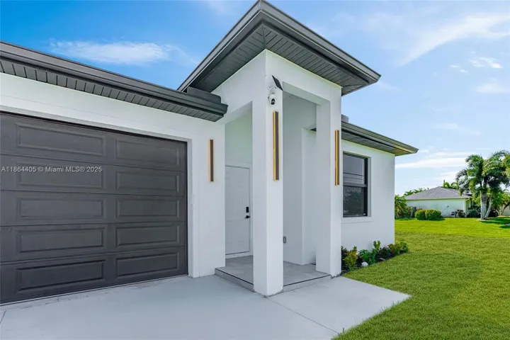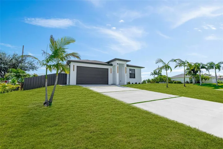 Stunning NEW construction pool home in Cape Coral! Located near Santa Barbara Blvd, this Roma model sits on a premium corner lot and features high ceilings, 3 bedrooms, 2 bathrooms, and a 2-car garage with extended driveway. Inside, enjoy porcelain tile floors, impact-resistant windows and doors, and a bright open-concept design with LED lighting. The kitchen includes a quartz waterfall island, sleek cabinetry, and stainless steel appliances. Bathrooms showcase a modern style with designer fixtures, while the master suite offers a glass-enclosed shower and double vanity. Step outside to your private pool with a spacious terrace, ideal for relaxing or entertaining. Conveniently located near schools, shopping, dining, and parks, this home combines comfort, style, and the Florida lifestyle.