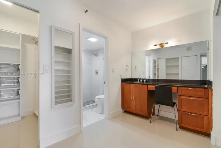 This tastefully updated unit features porcelain floors, a modern kitchen with granite countertops and stainless steel appliances, updated bathrooms, custom-built closets, and an in-unit washer and dryer.