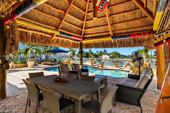 But the magic unfolds outdoors. A sparkling pool w cascading waterfall & jacuzzi glimmers under the sun. A tiki bar & built in BBQ invite evenings of laughter all w the lake shimmering as your backdrop.