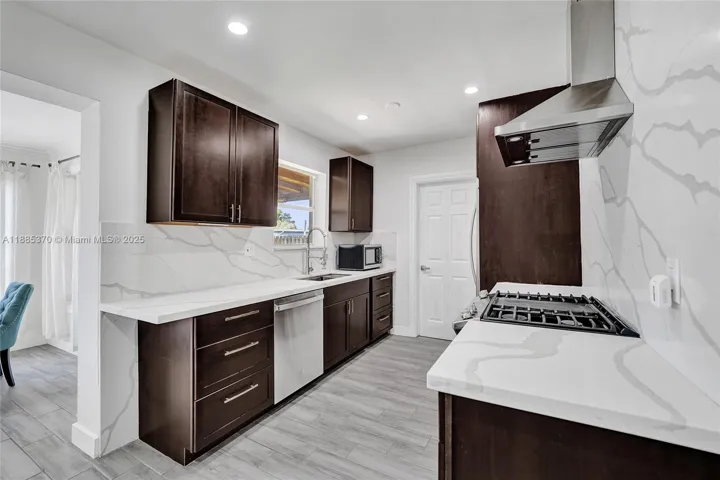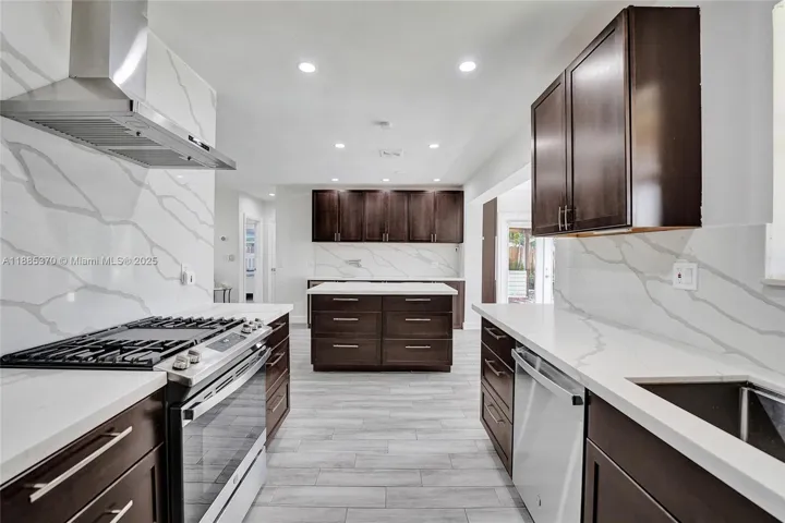 This beautifully remodeled 3BR/2BA pool home in Riverland Village is just minutes from Downtown Fort Lauderdale, beaches, dining, shopping, and highways—Miami or West Palm Beach in under an hour. Enjoy a tropical oasis with a fenced backyard, pond, grass, and 2 covered patios. Swim day or night in the above-ground pool with sundeck and landscape lighting. Inside, enjoy plank tile floors and a stunning Chef’s Kitchen with dark wood cabinetry, quartz counters and full backsplash, gas stove, stainless steel hood and appliances. The impressive island has bar seating and a huge coffee bar with a sink and pot filler. Split bedrooms offer a private primary suite, and all baths were remodeled with glass-enclosed showers. 1-car garage, Aluminum Roof, sidewalks, parks, good schools nearby—no HOA!