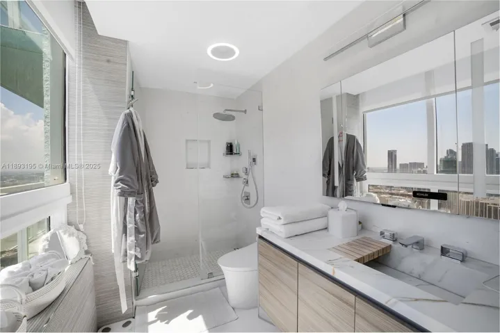 This stunning 2-bedroom, 2-bathroom corner condo on the 44th floor in Edgewater offers sweeping views of Biscayne Bay at sunrise and the Miami skyline at sunset. Located directly across from Margaret Pace Park, enjoy waterfront trails, outdoor fitness stations, a dog park, playground, green spaces, and vibrant restaurants just step away. Renovated in 2022 with high-end finishes, the residence features custom Italian cabinetry, marble kitchen countertops, Bosch appliances, a built-in wine cooler, and designer fixtures and furnishings. The apartment has never been rented before; the owner did not spare in renovations. It is truly the best deal in the building!