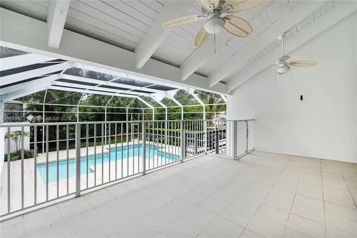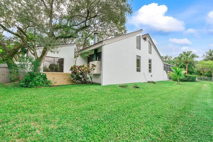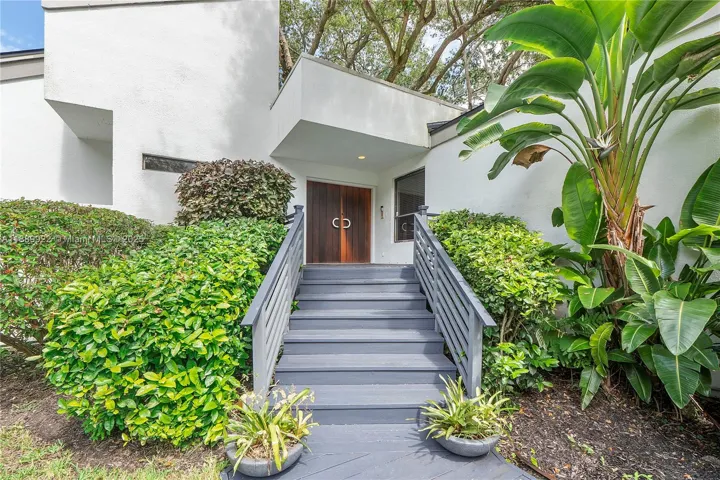 Mid-century modern 4BR/3BA + loft residence in Palmetto Bay, designed by architect Marc Firestone. Encompassing 4,362 total SF, this canal-front gem sits on a quiet cul-de-sac surrounded by majestic oaks and lush landscaping. The home embraces indoor-outdoor living with a central atrium. Vaulted wood-beamed ceilings, walls of glass, and natural light define the open spaces. A spiral staircase leads to a loft overlooking the family room with fireplace and bar. The kitchen opens to a covered screened terrace and patio with heated pool ideal for entertaining. Features include new plank flooring, 2024 metal roof, ample parking, and a private concrete boat launch.