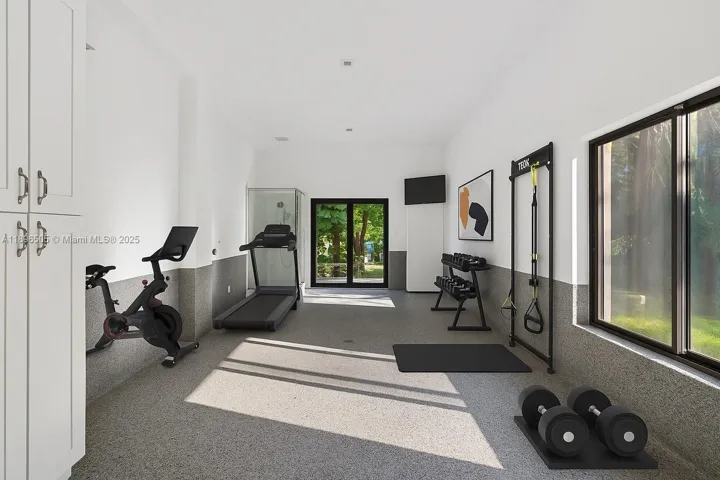 Flexible spaces include a extra room ideal for a gym, playroom, pet spa, or studio, plus several additional rooms for storage or work areas. Outside, enjoy a sparkling pool, covered patio, & full summer kitchen surrounded by tropical landscaping.