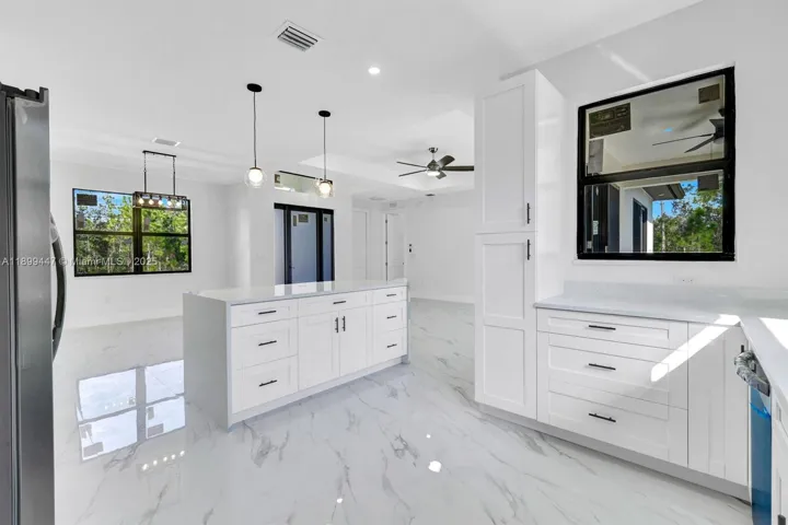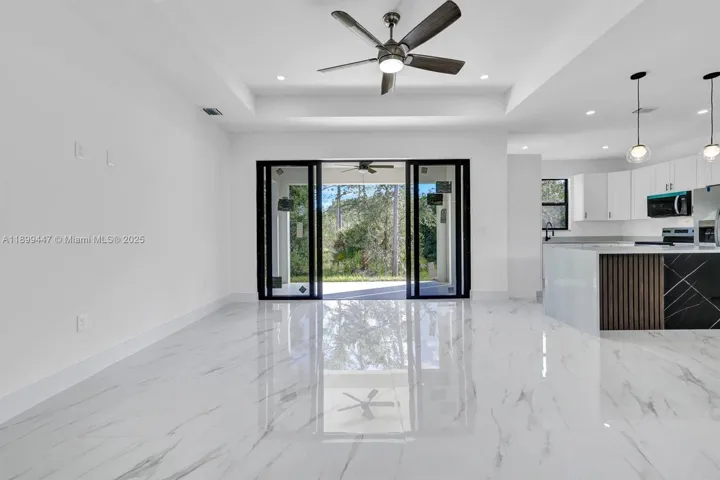 Brand new 2025-built 3BR/2BA home on a quiet street in Lehigh Acres offers 1,569 sq ft of open-concept living. High-end finishes include porcelain tile floors (no carpet) and quartz countertops in kitchen and baths, plus a gourmet kitchen with stainless appliances. Covered lanai off living area for outdoor dining; the primary suite has a private lanai perfect for morning coffee or stargazing. A split-bedroom design ensures privacy, and the master suite has two walk-in closets and a spa-like bath with dual sinks.