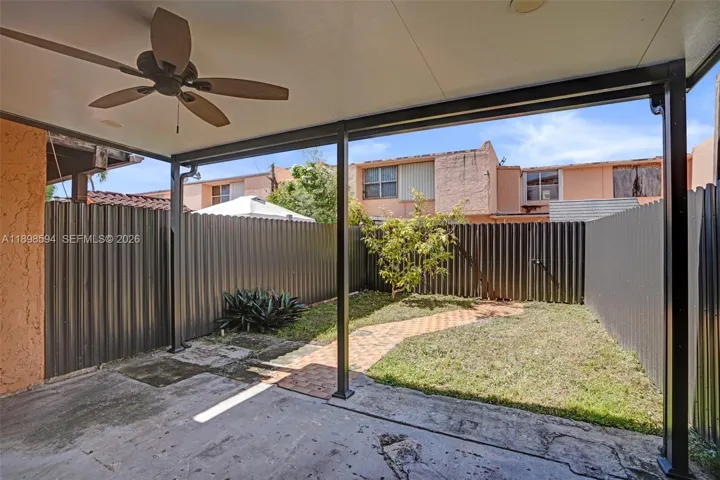 Spacious 3/2.5 townhouse condo offering 2,010 SF across 3 levels in desirable Mango Hill community, in heart of Hialeah. Second floor features an open-concept layout with kitchen, dining, living area + convenient half bath. All bedrooms are privately located on third floor. Ground level includes a large family room and a converted garage with impact French doors—currently used as storage, but an excellent opportunity for an income-producing efficiency, or multi-generational living space. Enjoy outdoor comfort with a newly roofed patio overhang (2023) and fenced backyard (2023) perfect for entertaining. Convenient 2-car driveway in front of home. Centrally located near 826 & Okeechobee Rd, top schools, shopping (Lowe’s, Best Buy, Target, Home Depot, Walmart, Westland Mall), dining, parks, and public transit. Association collects LESS THAN 10% reserves; therefore, a minimum of 25% down payments likely. Please check with the lender. The 2026 budget is included in MLS and can be provided directly. The decorative fireplace does not convey.