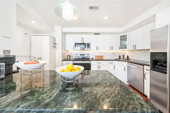 Beautifully updated 2-bedroom, 2-bath residence in highly desirable Sans Souci Estates, just minutes from the Beach & Bal Harbour Shops. This spacious unit features over 1,188sqft of bright living space. Serene City & Water views from both bedrooms. The primary suite includes a walk-in closet. Upgraded kitchen offers granite countertops, stainless-steel appliances, & a stylish backsplash. Additional highlights include hurricane shutters, newer A/C, and a tankless water heater. Enjoy resort-style amenities such as an Olympic-size heated pool, saunas, fitness center, library, lounge rooms, & in-house management. Maintenance covers high-speed internet, premium cable, water, sewer, pest control, & building insurance. Assigned parking & gated entry with ample guest parking.