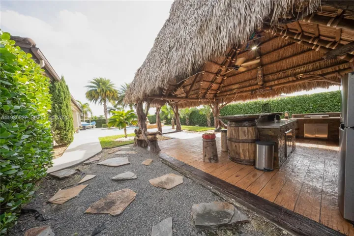 This well-maintained 4-bedroom, 3.5-bath home features a roof replaced in 2019 and offers outstanding indoor and outdoor living. The property showcases a spectacular tropical oasis backyard, designed by a renowned artist and sculptor, creating a truly unique and dream-like space with a Tiki Bar & Kitchen, ideal for entertaining and outdoor living.