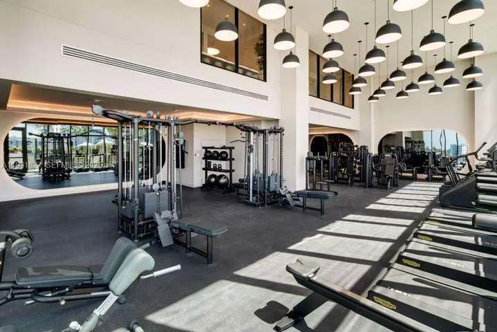 rooftop, fitness center, yoga lounge, kids’ playroom, on-site dining, concierge services, and a golf cart shuttle to