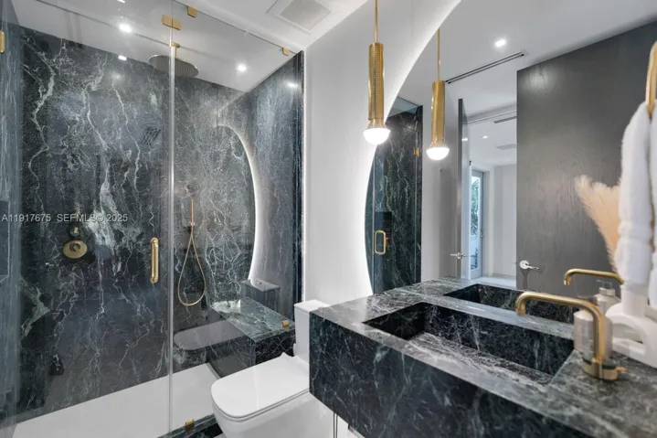 Experience the ultimate blend of waterfront serenity & modern luxury in this 5BD/5BA masterpiece, inspired by earthy sophistication. Enjoy 60′ of open bay water frontage, a heated saltwater Infinity-edge pool & outdoor lounging areas. Grand open living spaces transition effortlessly to the outdoors, creating an ideal setting for entertaining. A sleek sunroom with floor-to-ceiling glass captures natural light & opens to an expansive rooftop terrace. Inside, the chef’s kitchen is outfitted with Taj Mahal quartzite, a custom island, bespoke cabinetry & Subzero/Wolf appliances. Travertine-clad walls & ambient-lit stairs frame the foyer. Primary suite features custom millwork, infinity leather-wrapped panel & steam shower. RH furnishings & curated finishes complete this one-of-a-kind residence.