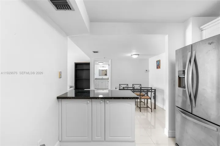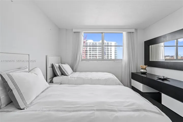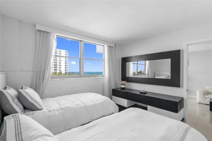 Furnished 2-bedroom, 2-bath residence at The Manatee, a well-maintained oceanfront building in Surfside. This comfortable and functional unit features a split-bedroom floor plan, hurricane impact windows and doors, and a balcony with ocean views. The spacious primary suite offers room for a sitting area, a walk-in closet, and an en-suite bath with a tub. The second bathroom features a walk-in shower and coordinating tile finishes. The kitchen is thoughtfully finished with generous counter space, and an open breakfast area with snack bar seating that flows into the main living space. A dedicated laundry room with washer and dryer in-unit provides practical storage and everyday convenience. The Manatee offers direct beach and boardwalk access, a community pool, 24 hour lobby concierge, Shabbat elevator, on-site management, and an assigned garage parking space with guest parking available. Ideally located next door to the Surfside Community Center and close to shops, dining, and Bal Harbour Shops.