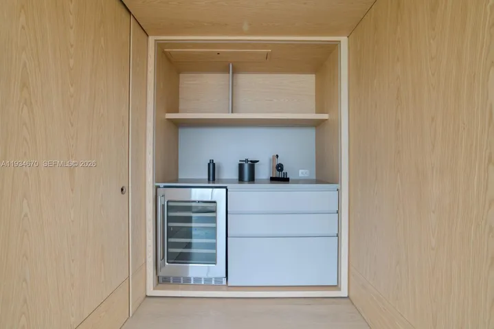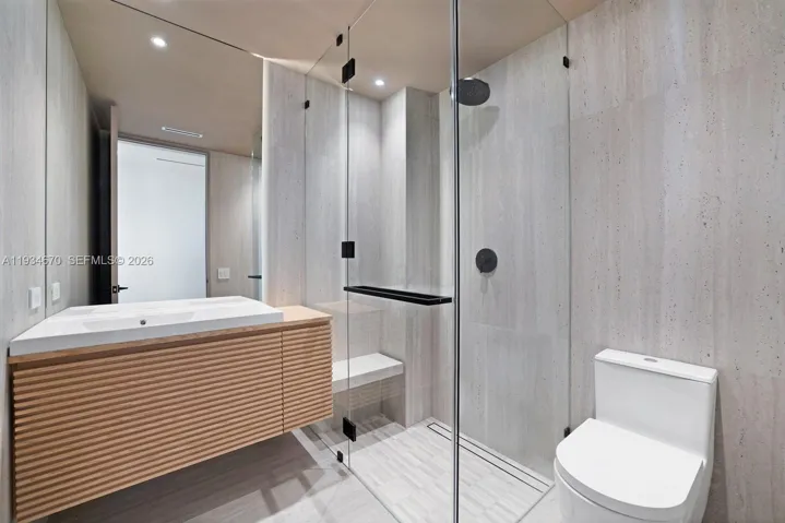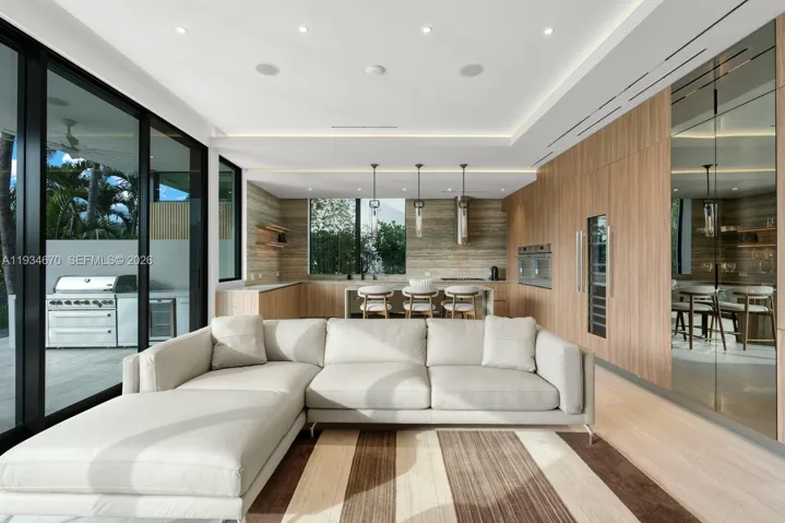 The ground floor presents a sophisticated Italian kitchen with informal dining and living area, complemented by an elegant formal dining room and a beautifully appointed salon. A private office, powder room, and guest bedroom complete this level. Expansive glass doors open from both the kitchen and salon to a gracious terrace and landscaped backyard, creating seamless indoor-outdoor living. The waterfront setting features a resort-style pool, spa, summer kitchen, and private dock with direct ocean access and no fixed bridges.