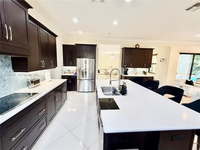 Spacious 5-bedroom, 4.5-bath residence (with potential for up to 7 rooms) including a fully finished office on the first floor and a sitting room off the primary suite that can easily function as an additional bedroom, nursery, or private Den***Located in a prestigious gated community with top A-rated schools, this modern home features a dramatic 20-ft foyer with custom wood and steel staircase, porcelain and wood flooring, and impact windows throughout***The chef’s kitchen offers a large island, double ovens, coffee bar, stainless steel appliances, soft-close cabinetry, and tiled backsplash***Step outside to a private resort-style backyard surrounded by lush greenery featuring a heated saltwater pool, cascading waterfall, sun deck, jacuzzi, and automated patio screens***Additional highlights include a two-car garage with epoxy flooring, wall A/C, refrigerator, generator switch, and low HOA of only $235/month.