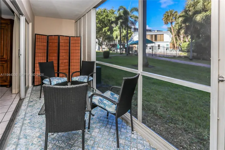 Inside, a welcoming foyer with a double-door closet opens to a spacious living and dining area filled with natural light. Sliding doors lead to a screened patio accessible from both the living room and the primary bedroom, with direct access to the garden and pool area—perfect for enjoying South Florida’s indoor-outdoor living.