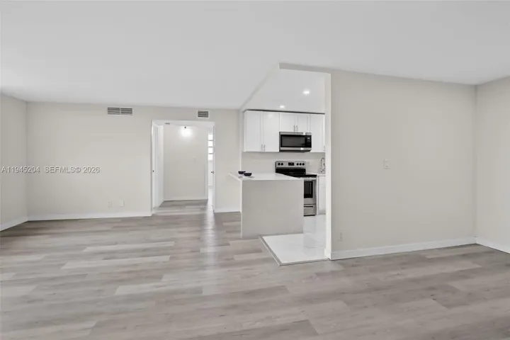2025 REMODELED 2-bedroom, 2-bath CORNER PENTHOUSE offers an exceptional layout with a spacious living and dining area filled with natural light. The open kitchen features elegant quartz countertops and backsplash, complemented by stainless-steel appliances, perfect for both everyday living and entertaining.