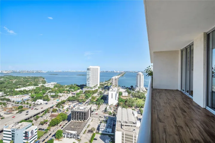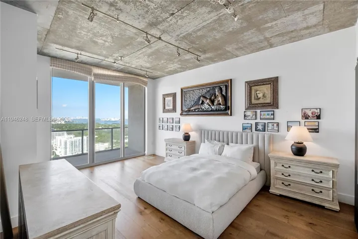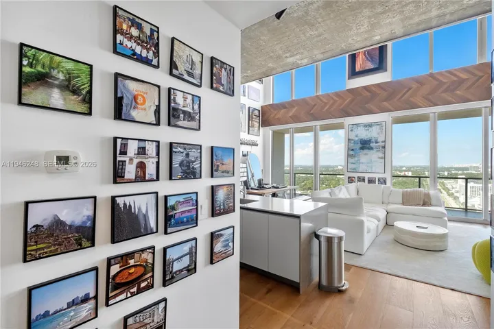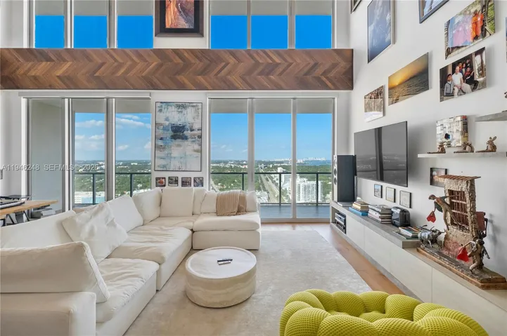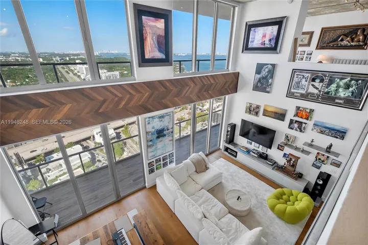 Exquisite two-story penthouse in the heart of Midtown Miami. This one-of-a-kind loft features 2 bedrooms + den, 2.5 bathrooms, and captivating north, west, and east exposures. Multiple terraces, including an expansive wraparound upper terrace, offer panoramic city, bay, and skyline views that capture both sunrise and sunset. Soaring 20-foot floor-to-ceiling windows flood the home with natural light, while double-height walls create a gallery-style backdrop ideal for large-scale art or statement lighting. Thoughtfully renovated with a custom Ornare kitchen, marble countertops, Armadi closets, Mia Cucina bathrooms, and European oak hardwood floors. Offered fully furnished and move-in ready, includes two parking spaces and prime access to the Design District, Wynwood, and Biscayne Bay