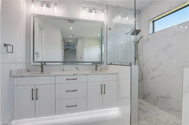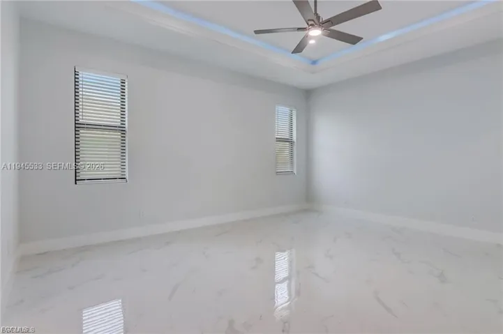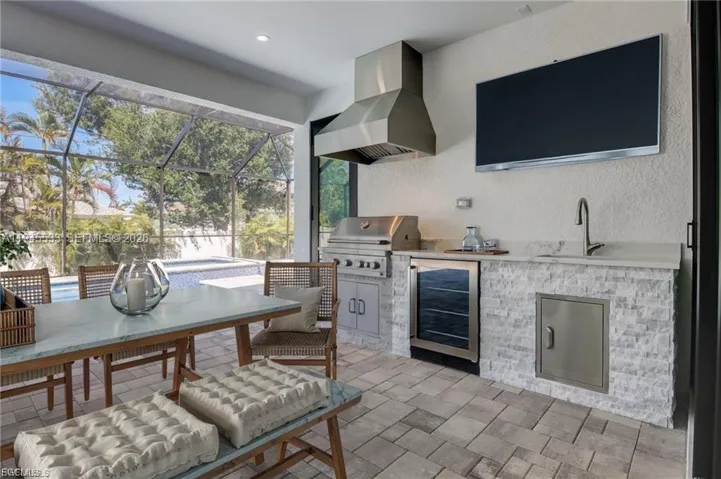 This is a Large home for the family and your guests with over 2560 air-conditioned Living space all with 4 Bedrooms, Office, 3 Full bathrooms and has 2 Primary Master suites, 3 car Garage, heated Pool & Jacuzzi, barbeque area with beverage cooler. South of Cape Coral Pkwy W. right by Cape Harbor. This Large dream home with over 2560 sq feet of Living space and over 4600 total spaces. Master Bedroom is large and has LED Tray Ceilings Double French Impact glass doors. Master Bathroom with walk-in shower large soaking tub with large back and front lit mirror Master suite guest bedroom, you have LED lited tray ceilings you have a Full Bathroom with lited mirror, walk-in closet. Bedroom has French Impact doors that go out to the pool area. Porcelain tile Floors throughout. High double tray LED lited ceilings. Living Room has Electric Fireplace. Included is a large 87-inch smart TV. Entire Resistant Windows & Impact doors lead out to the large covered screened in Lanai for indoor outdoor living with built in Barbeque with Industrial Vent that is vented out when cooking also has Wine and Beverage cooler + sink. Stainless-Steel Appliances, Gigantic Quartz Counter Island waterfall, Under Large Quartz counter is so much hidden storage. Along with soft closing cabinets. Nice size Pantry. Wine rack & Beverage cooler. Tile Roof. Driveway is Large with brick pavers. Laundry Room with cabinets, sink and Quartz countertop as well.