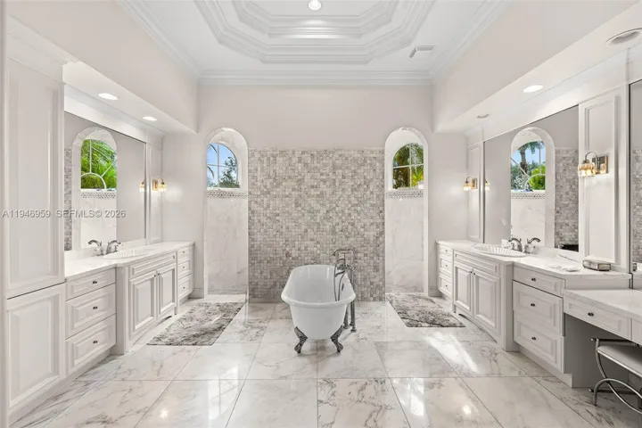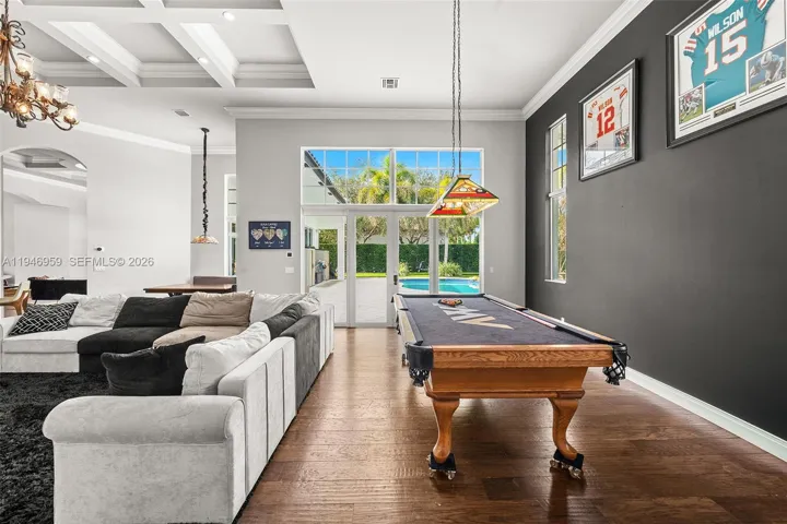 Villa Stonebrook presents a private retreat designed for comfort, functionality, and entertaining. The home is thoughtfully arranged around a central pool area, creating seamless indoor-outdoor flow complemented by a fully equipped summer kitchen. Interior highlights include hardwood flooring, dramatic ceiling details, and expansive living spaces filled with natural light. The open kitchen serves as the centerpiece of the home, connecting effortlessly to the casual dining area and spacious family room. The primary suite features a marble-appointed bathroom with a sauna and walk-in shower and oversized closet space. An outstanding opportunity to own a distinctive residence within Stonebrook Estates.