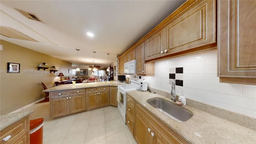 The kitchen is equipped with light wood cabinetry, white appliances, and a neutral countertop, offering both functionality and style. A breakfast bar with seating creates a casual dining option, while the adjacent dining area features a chandelier and ample space for family meals or entertaining.