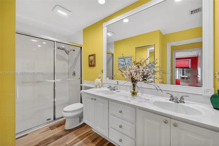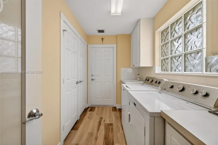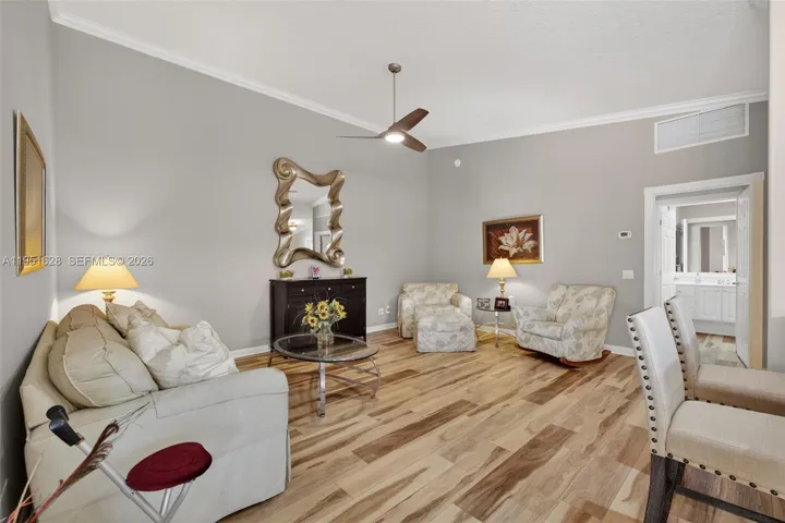 Approximately 1,500 square feet, this two-bedroom, two-bathroom house is located in THE LAKES, a gated, mature community. The home features premium vinyl flooring throughout and quality materials, including crown moldings. The private pool provides a refreshing retreat.