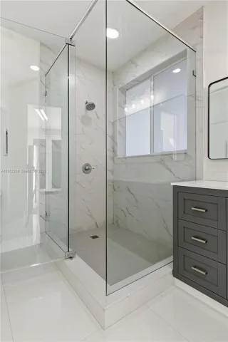 Spa Bathrooms: Stripped to the studs with floor-to-ceiling marble-style tile, seamless glass showers, and elevated finishes.