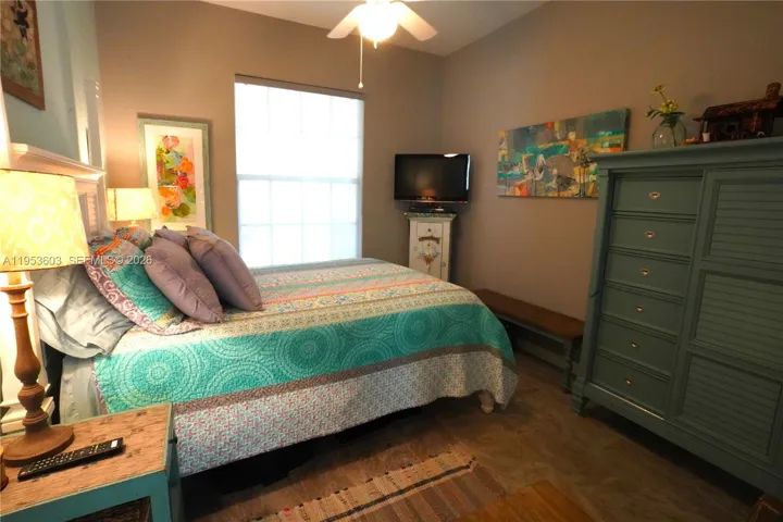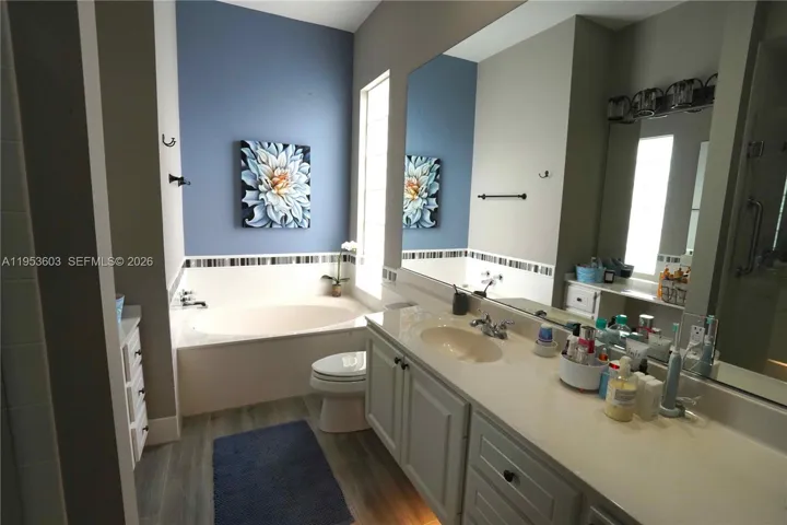 Architectural details abound with crown molding throughout and a massive master suite featuring his-and-her vanities, a soaking tub, and multiple walk-in closets. Enjoy the Florida lifestyle on the expansive screened patio, finished with premium gray pavers, paddle fans, and a Miami-approved “Storm Smart” motorized shade perfect for both storm protection and instant privacy. Backyard offers plenty of space for a pool. Additional upgrades include a new 2025 HVAC system, a central vacuum system, a new 2024 electric water heater, a dedicated laundry room with quartz countertops, and an oversized two-car garage with a new opener and attic storage.