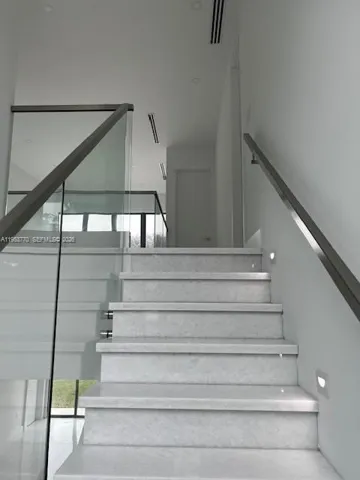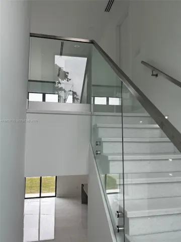 and pool. Features: open floor plan between kitchen, living area and dining area, marble staircase, glass railings,