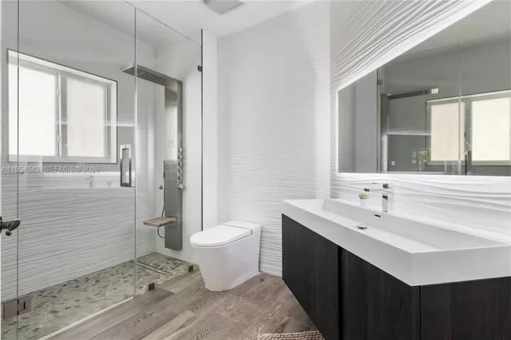 Indulge in refined luxury and timeless elegance in this exceptional 5 bedroom, 3 bath residence. The gourmet chef’s kitchen is impeccably appointed with Sub Zero appliances, a dual temperature wine cooler, and bespoke designer finishes that elevate both form and function. Sophisticated porcelain and ceramic flooring with an authentic wood inspired finish flows throughout the home, enhancing its polished aesthetic. The main level features a private bedroom with a full bath, ideal for distinguished guests or effortless multigenerational living.