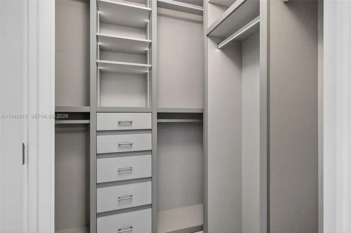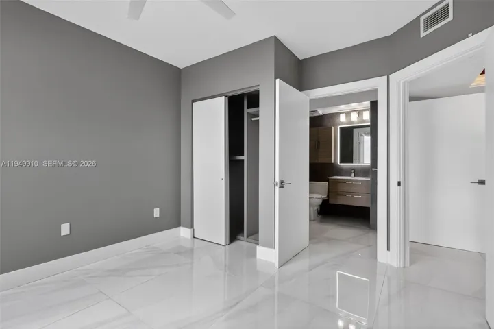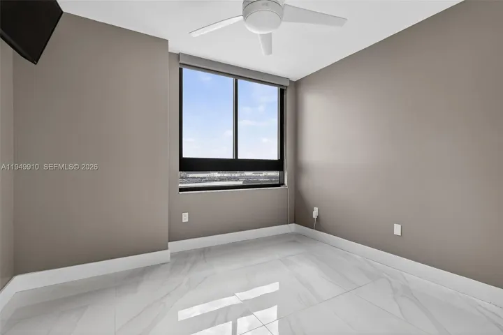 The spacious primary bedroom features a walk-in closet with custom cabinetry and dimming lights, along with a window framing views of Star Island and the world’s largest cruise ship port. The residence also includes a fully updated, custom-built in-unit washer and dryer for added convenience.