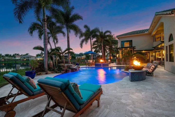 Step outside to your private backyard oasis featuring a resort-style pool, covered patio, and outdoor entertainment bar, perfect for relaxing or entertaining year-round.