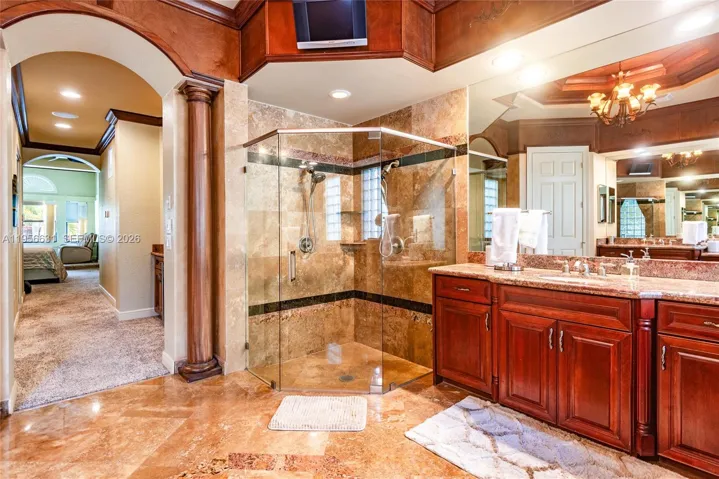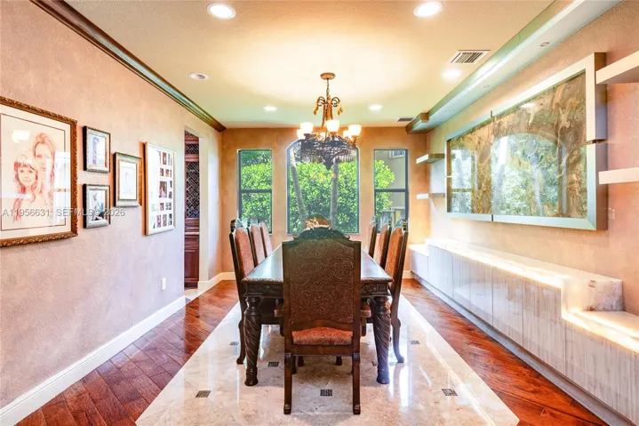 The newly updated dining room showcases a striking granite accent wall, adding a modern and elegant touch. The chef’s kitchen seamlessly flows into the expansive family room, highlighted by custom built-ins and oversized windows that flood the home with natural light and capture serene water views.