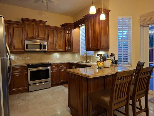 Charming one-story home in the highly desirable community of Doral Sands, a gated community with very low HOA. High-quality upgrades throughout with marble floors, wood cabinets, granite & marble tops, stainless. Roof tiles were replaced in 2021. Patio with beautiful ornamentals and fruit trees is ideal for entertainment: concrete pavers, brick BBQ, fountain, covered roof with fan, swings and lights. Doral Park Country Club offers restaurant, sport bar, gym, sauna, pool, jacuzzi, tennis & pickleball courts, and a beautiful children’s playground. Doral, considered a premier location with family-friendly neighborhoods and luxury living, is often ranked for its high quality of life, top-rated schools, booming business environment, parks, diverse dining, and entertainment options.