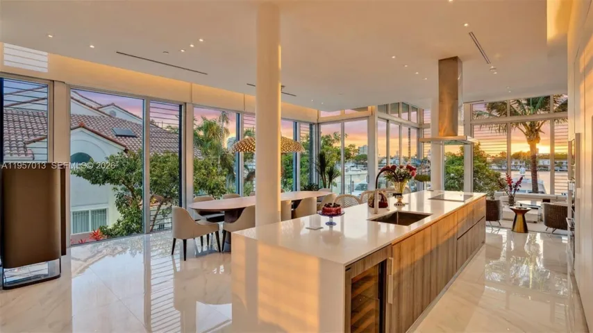 Designed by Interiors by Steven G. and furnished with Artefacto, the interiors showcase soaring ceilings, refined finishes, and a seamless indoor-outdoor flow. The open-concept layout features a private elevator, European Mia Cucina kitchen with Wolf and Sub-Zero appliances, ensuite bedrooms, and sunset-facing terraces overlooking the marina.