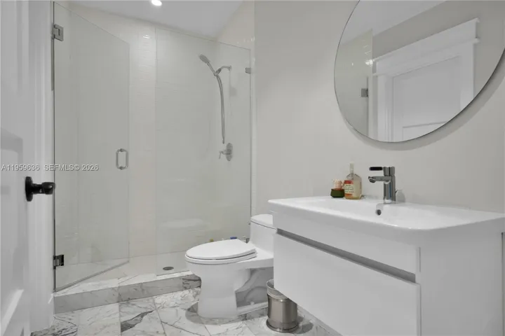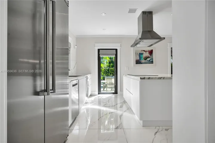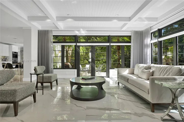 This light and bright, fully renovated 4-bed, 3-bath home offers an open-concept living space. Featuring porcelain floors throughout, hurricane impact windows and a new metal roof. The gourmet kitchen features a Carrara island, two sinks, Bosch appliances, and a Viking fridge-freezer. The spacious primary suite includes his/her walk-in closets and a luxurious spa-like shower. A fourth bedroom has been converted into a study. The private outdoor space is perfect for entertaining, with a heated pool, redone pavers, and lush landscaping. Additional upgrades include a security system and freshly painted interior and exterior. Move-in ready with no detail overlooked!