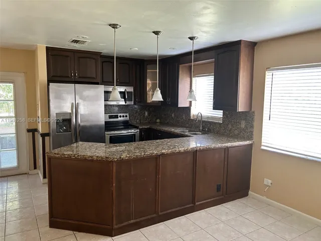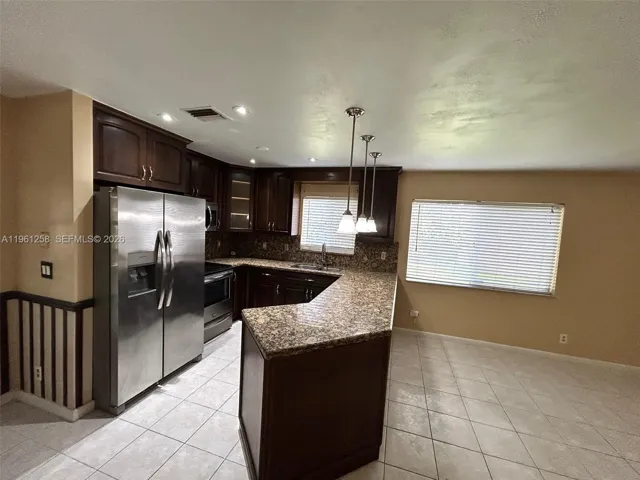 If you are looking for land, no neighbors behind you, low maintenance fee, mature fruit bearing trees, and room for a pool in Pembroke Pines, then this house is for you. The living room offers a generous area to welcome guest and is a great introduction to the home. The dining area offers a peek into the backyard where mango and avocado trees can be seen and become a source of conversation. There is a breakfast area next to the kitchen and the flow of the kitchen must be seen to appreciate. Hanging pendant lighting over the spacious primary granite kitchen counter is elegant and purposeful. The sink area has a window for viewing the backyard as well as brining in natural lighting to the space. The family room is where most of the congregating will take place as it is close to the kitchen, the heart beat of the house. The screened patio is where the breeze and the sound of the wind rustling through the leaves of the trees is priceless. The Primary suite is upstairs with its walk-in closet and spacious bath lounge area. Each of the 3 other bedrooms can easily hold a queen size bed. The garage is an actual garage that will accommodate two cars. This is a house that you must come and see it today.