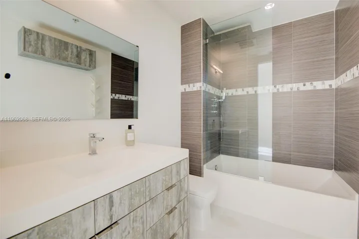 Exclusively renovated 2-bedroom, 2-bath modern loft with 10-foot ceilings and stunning bay views. Open layout with modern finishes, smart kitchen appliances, spa-like bathrooms, and a private balcony overlooking Biscayne Bay. No special assessments and low holding costs. Waterfront building with pool, jacuzzi, sauna, gym, 24/7 security, and covered parking.