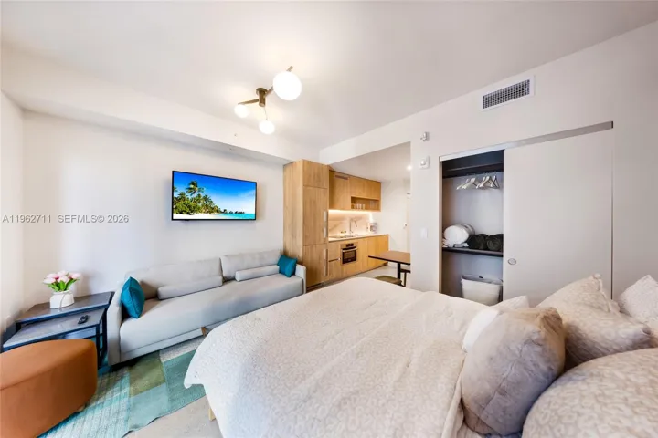 Fully furnished studio at The Crosby Miami. Turnkey and ready to generate income immediately after closing. Ideal for short-term rentals or vacation home. Daily rentals are allowed in the building. Floor-to-ceiling windows and resort-style amenities featuring a rooftop pool, spa, sauna, fitness center, indoor garden, and 24/7 concierge service. Prime location just steps from kaseya Center, Brightline, world-class dining and entertainment. One of the lowest HOA fees in the area. Includes a storage unit.