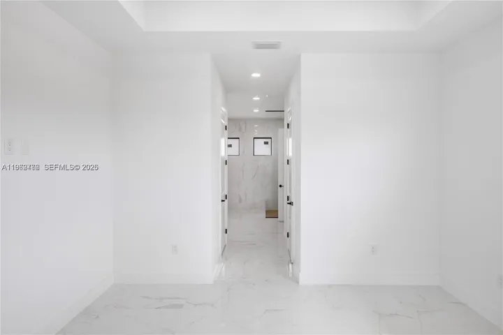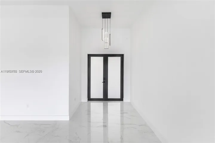 throughout. Elegant marble floors flow into a modern kitchen featuring sleek white cabinetry and bold black