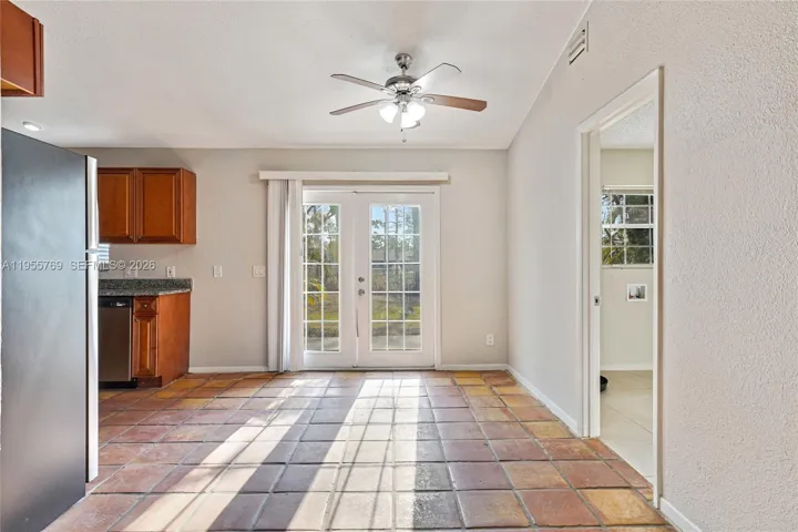 The home features a screened front porch, ceiling fans throughout, tile floors in main living areas, and carpeted bedrooms. Inside you’ll find French doors, recessed lighting, and a bright, open layout. The kitchen is equipped with stainless steel appliances, and a dedicated laundry room includes washer and dryer hookups for added convenience.