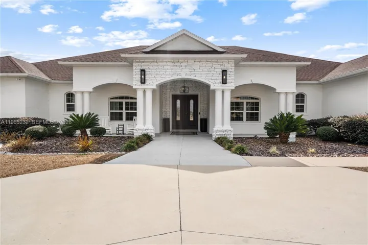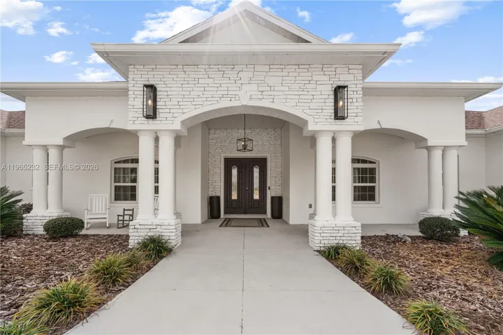 Set on approximately 10.47 fully fenced acres in Ocala’s premier countryside, this private estate offers refined living with exceptional equestrian potential, just minutes from the World Equestrian Center, Golden Ocala, and Adena Golf & Country Club. The 6,100+ sq ft main residence features soaring ceilings, abundant natural light, and Italian porcelain tile throughout. The chef’s kitchen showcases dual oversized islands, Brazilian marble countertops, premium appliances, and a gas range. The primary suite includes a sitting area, fireplace, patio access, dual walk-in closets, and a spa-style bath. Additional highlights include an expansive indoor pool and spa, covered outdoor living with summer kitchen, and a separate guest cottage. Zoned A-1, allowing horses and future barns or paddocks.