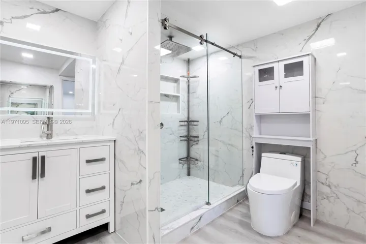 The unit features a brand new kitchen with modern cabinetry, new appliances, and classic quartz countertops. Additional upgrades include a tankless water heater, fully renovated bathrooms, new flooring throughout, and a freshly painted interior. The spacious layout includes a large closet and the convenience of an in unit washer and dryer.