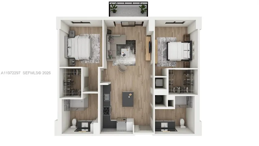 The primary suite provides a serene retreat with a spa-inspired bath and generously sized closet with built-in storage, while additional bedrooms offer flexibility. Private balcony spaces extend the living area outdoors—perfect for morning coffee or evening relaxation.
