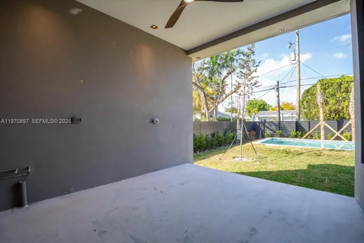 The outdoor space is designed for both relaxation and entertaining, with a resort-style pool, covered terrace, and fully fenced yard creating a private oasis.