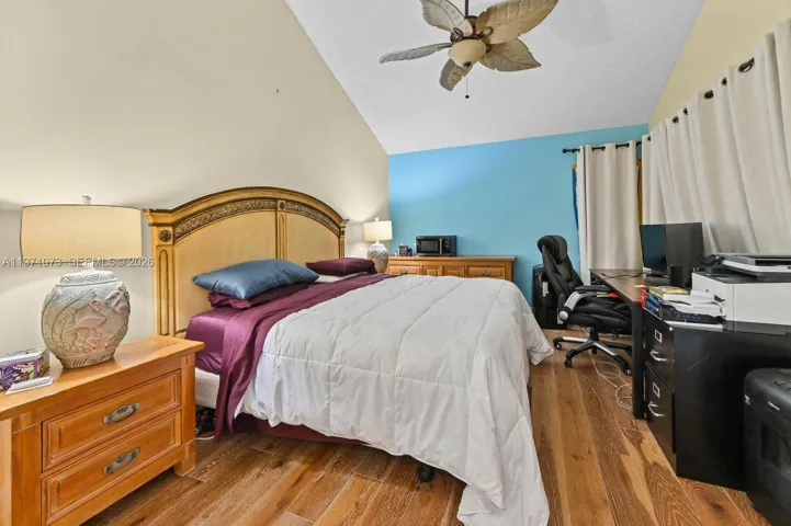The home has recently been renovated, including updated kitchen with new quartz countertops, new cabinetry and stainless steel appliances. Both bathrooms have also recently been updated, including new flooring, walk-in showers new vanities, with high end finishes. All windows and sliding glass doors are new high quality insulated impact glass. Home is quite spacious with vaulted ceilings The flooring throughout the main living area is high quality engineered hardwood. There is a very nice, well maintained private, heated pool and pool deck located in the backyard area of the property. The property has a spacious, airconditioned 2 car garage.