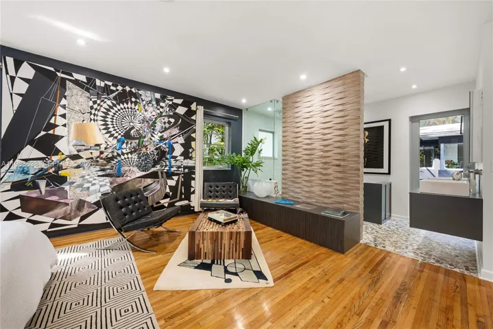 Across from the bay in the heart of Miami’s Upper Eastside, the residence embodies the optimism and flow of original Mid-Century design. The wood & brick paneled living room anchors the home with warmth, comfort and texture. Walls of floor-to-ceiling glass dissolve the boundary between interior and landscape. High ceilings amplify the sense of volume and light, illuminating black terrazzo floors, and sculptural architectural gestures. The covered, private pool is one of them. Every detail and room reinforces the home’s as a place for creating new memories for you and your guests.