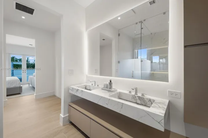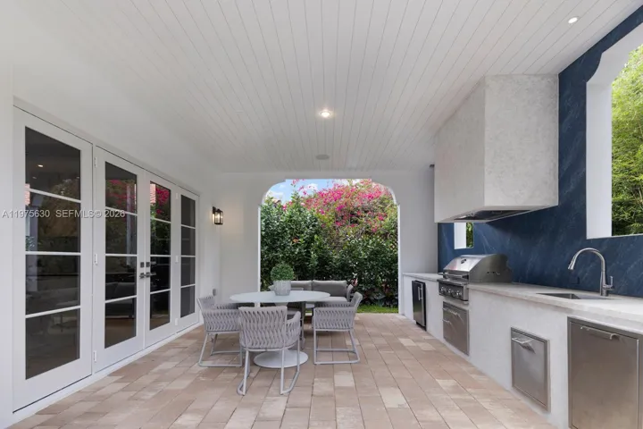Exquisite modern Dutch–Caribbean masterpiece offering the perfect blend of architectural sophistication and relaxed luxury living. Secured motor court entry with a two-car garage welcomes you into this spectacular two-story residence featuring 4 bedrooms, 5.5 baths, and a dedicated ground-level office (also serves as bedroom with ensuite bathroom). Designed by award-winning Locus Architecture, the home showcases dramatic scale and seamless indoor-outdoor flow. Expansive living spaces featuring a mud room, 20ft ceilings, wine cooler bar and open spaces to a covered kitchen and summer entertaining area overlooking a stunning pool deck ideal for hosting or everyday family living. Every bedroom features its own private covered balcony, ensuite bathroom and walk-in closet creating serene retreats throughout and comfortable living. The chef’s kitchen is fully outfitted with top-of-the-line Sub-Zero, Cove and Wolf appliances, complemented by custom cabinetry by Mia Cucina throughout the home, delivering exceptional craftsmanship and refined detail at every turn. A rare offering combining architectural pedigree, premium finishes, and effortless elegance.