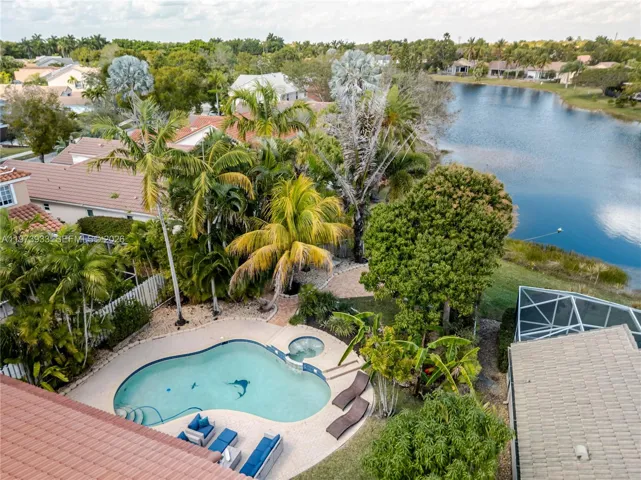 Step outside to a serene backyard retreat featuring a pool, jacuzzi, covered patio, and spectacular lake views with a tranquil walking path perfect for relaxing or hosting gatherings.